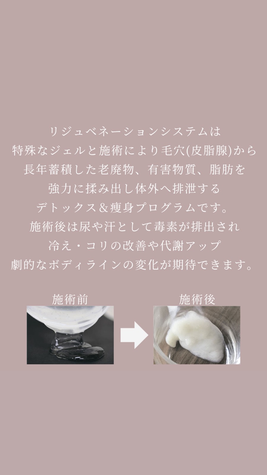 あとは当店エステサロンですので、私たちにお任せいただければ全身のリンパ節を解放し全身の血流を良くし、さらに毛穴(皮脂腺)から余分な脂肪や老廃物を直接手で出すことができるリジュベネーションシステムで、腕だけじゃなく全身を変えていく事が出来ます。